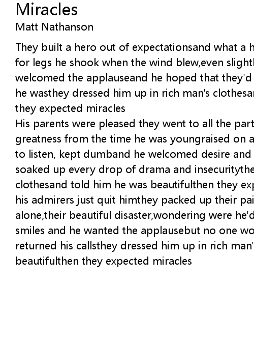 His parents were pleased they went to all the partieshe was groomed for greatness from the time he was youngraised on a diet of televisionhe was taught to listen, kept dumband he welcomed desire and reckless luxuryand the world soaked up every drop of drama and insecuritythey dressed him up in rich man's clothesand told him he was beautifulthen they expected miraclesand then one day his admirers just quit himthey packed up their paint and were goneand he stood alone,their beautiful disaster,wondering were he'd gone wrongand he wanted the smiles and he wanted the applausebut no one would look him in the eye now,no one returned his callsthey dressed him up in rich man's clothesand told him he was beautifulthen they expected miracles |