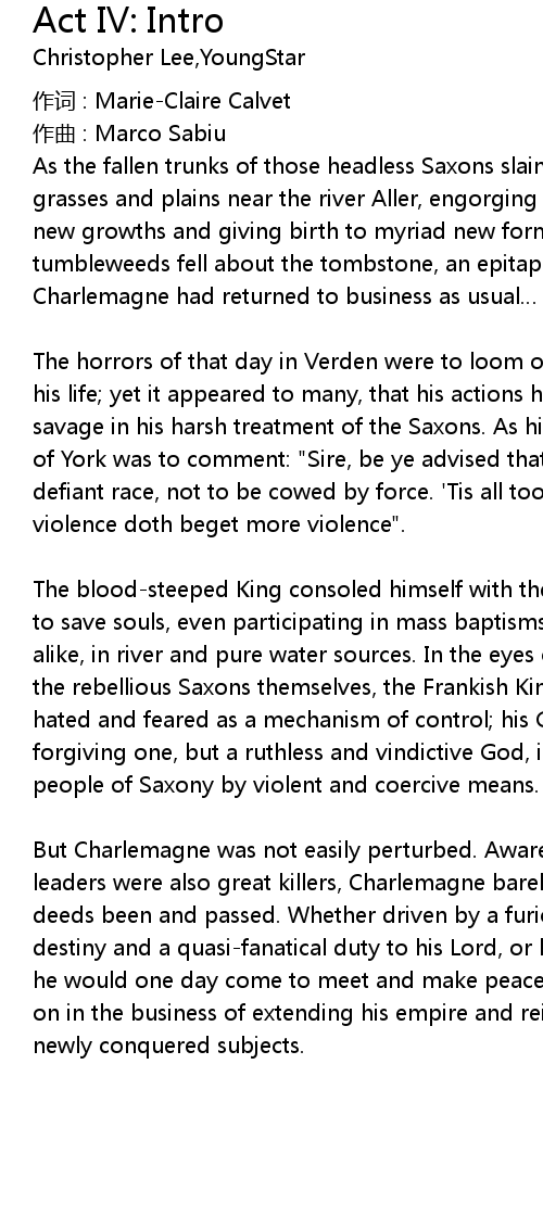 | The horrors of that day in Verden were to loom over Charlemagne for the rest of his life yet it appeared to many, that his actions had become increasingly savage in his harsh treatment of the Saxons. As his wise scholar friend Alcuin of York was to comment: " Sire, be ye advised that the Saxon are a proud and defiant race, not to be cowed by force. ' Tis all too evident a truth that violence doth beget more violence". | |