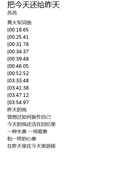 | [04:14.79][03:47.12][02:51.72][01:12.40] | 把今天还给昨天 |