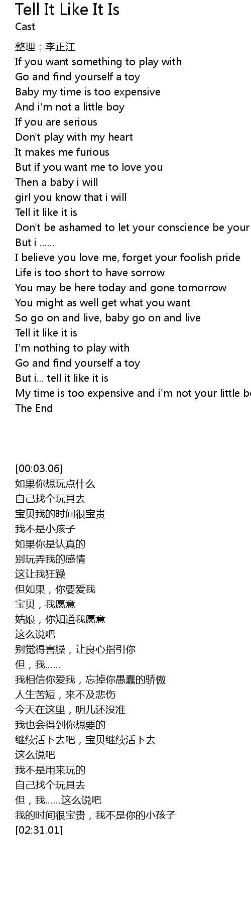 | [02:19.56] | But i... tell it like it is |