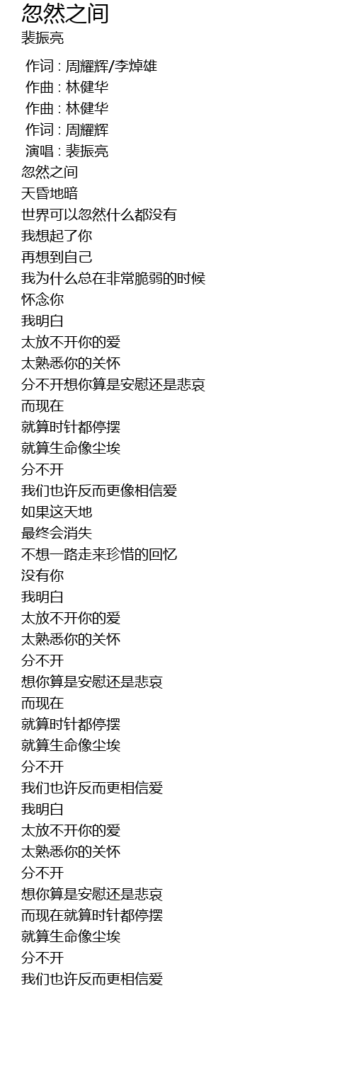 | [00:22.000] | shì jiè kě yǐ hū rán shén me dōu méi yǒu |