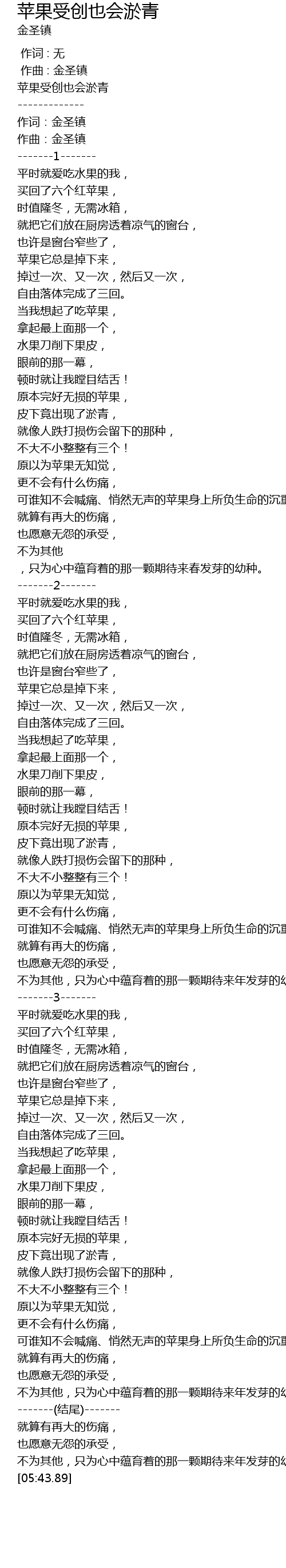 | [03:03.68] | 可谁知不会喊痛、悄然无声的苹果身上所负生命的沉重, |