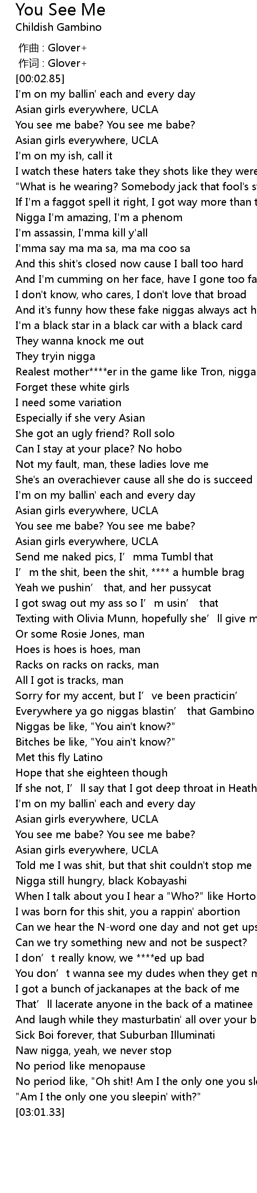 | [02:03.10] | Everywhere ya go niggas blastin’ that Gambino |