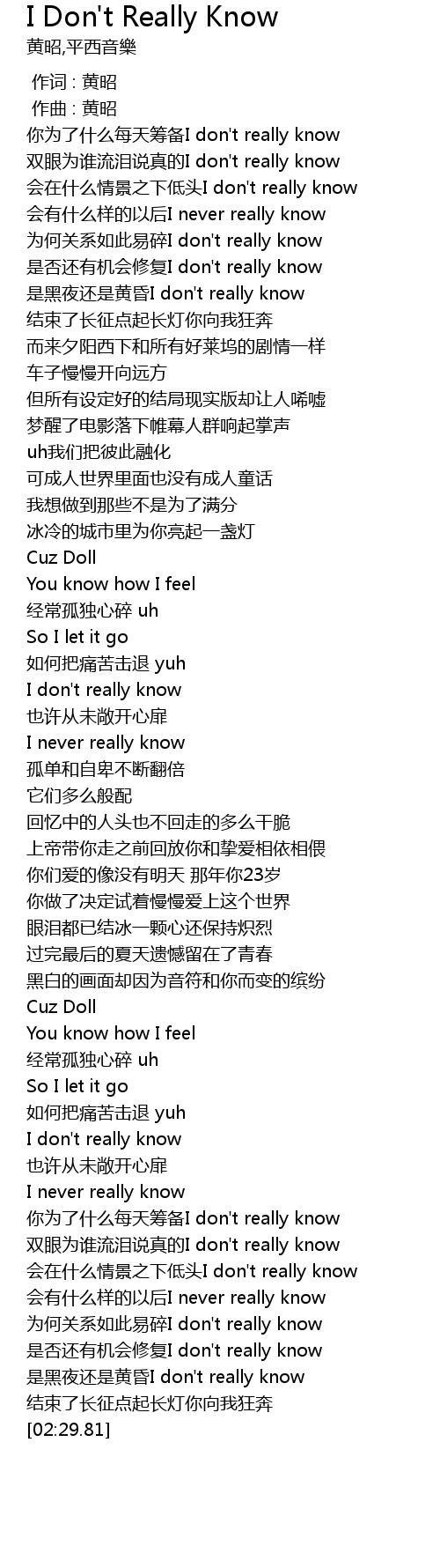 | [02:08.58] | 你为了什么每天筹备I don't really know |