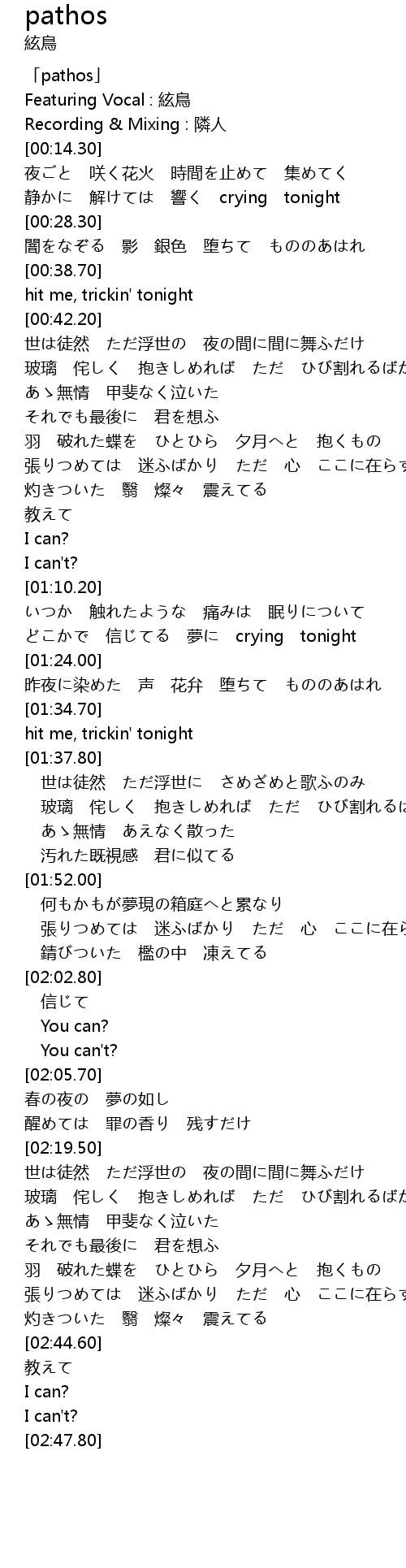 | [01:24.60] | 昨夜に染めた 声 花弁 堕ちて もののあはれ |