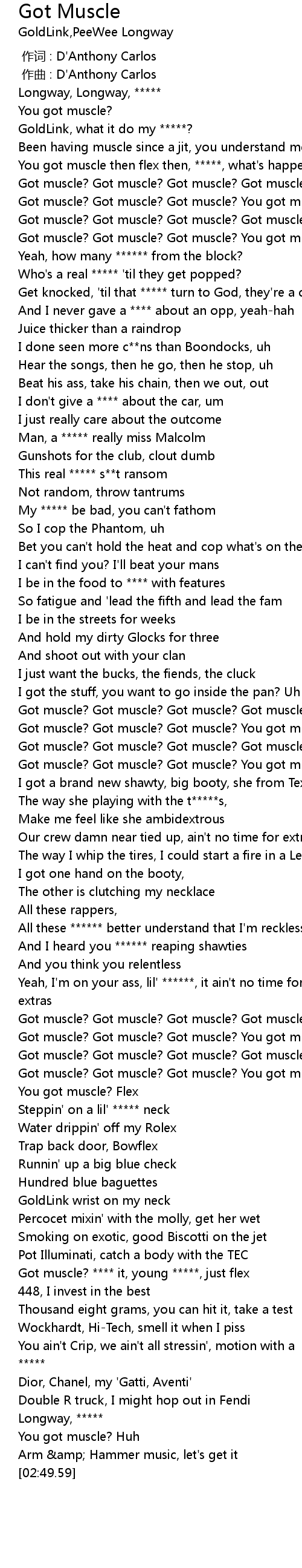 | [02:09.56] | Got muscle? Got muscle? Got muscle? You got muscle? Flexin 39 |