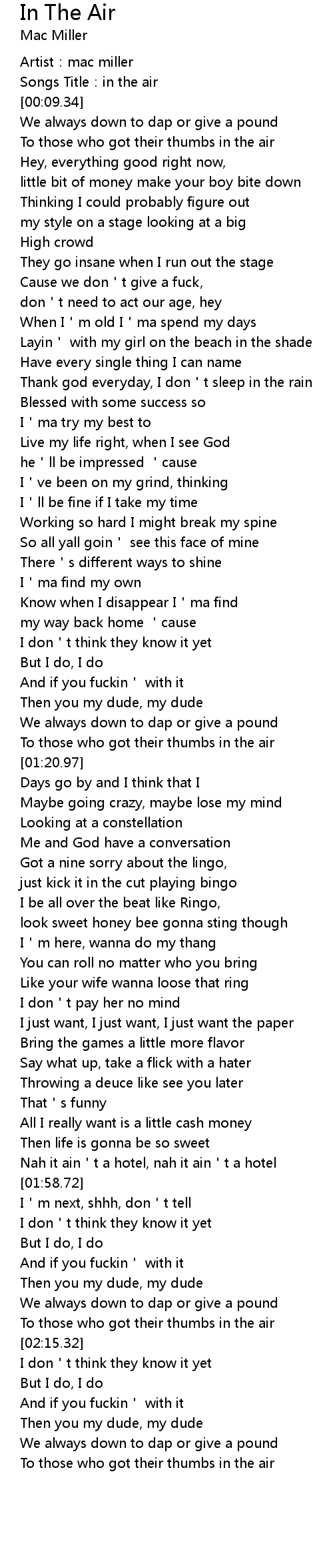 | [00:04.22] | Songs Title: in the air |