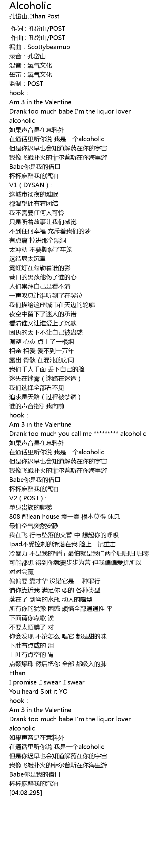 | [03:43.106] | 在通话里听你说 我是一个alcoholic |
