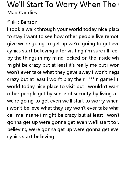 | i took a walk through your world today nice place to visit but i wouldn' t want to stay i want to see how other people live remote control and not a thought to give we' re going to get up we' re going to get even we' ll start to worry when the cynics start believing after visiting i' m sure i' ll feel fine i' ll be placated by the things in my mind locked on the inside while i' m out here running free i might be crazy but at least it' s really me but i won' t believe what they say won' t ever take what they gave away i won' t negate call me insane i might be crazy but at least i won' t play their in game i took a walk through your world today nice place to visit but i wouldn' t want to stay i want to see how other people get by sense of security by living a lie we' re going to get up we' re going to get even we' ll start to worry when the cynics start believing but i won' t believe what they say won' t ever take what they gave away i won' t negate call me insane i might be crazy but at least i won' t play their in game were gonna get up were gonna get even we' ll start to worry when the cynics start believing were gonna get up were gonna get even we' ll start to worry when the cynics start believing |