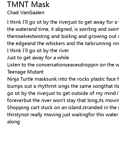 Ninja Turtle masksunk into the rocks plastic face half buriedthe stone bottom bumps out a rhythmit sings the same songthat its always been singingthink i'll go sit by the riverjust to get outside of my mind.i'm wishing i could stay here foreverbut the river won't stay that long,its moving on. |