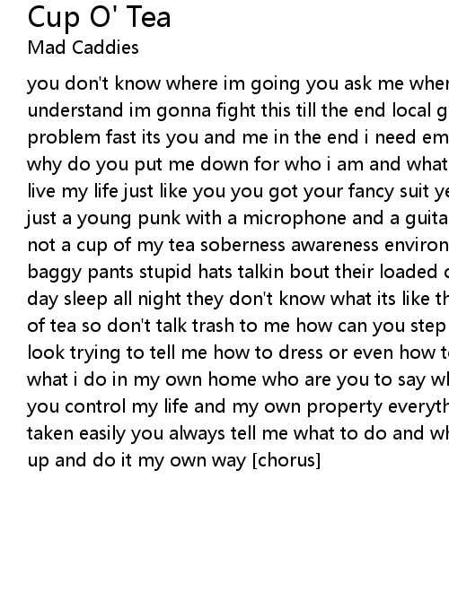 you don't know where im going you ask me where iv'e been you wish you couldn't understand im gonna fight this till the end local girls and you wont see the problem fast its you and me in the end i need em but you left and were not there why do you put me down for who i am and what i do i am just a person trying to live my life just like you you got your fancy suit yeah you got your caviar im just a young punk with a microphone and a guitar reality sobriety anxiety its not a cup of my tea soberness awareness environmental madness it should to be baggy pants stupid hats talkin bout their loaded cats they're wannabes work all day sleep all night they don't know what its like they're yuppies its not my cup of tea so don't talk trash to me how can you step up to me and tell me how to look trying to tell me how to dress or even how to cook who are you to judge what i do in my own home who are you to say what i can and cannot grow why do you control my life and my own property everything i have and own cannot be taken easily you always tell me what to do and what to say now its time to stand up and do it my own way [chorus] |