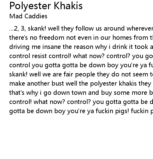 ...2, 3, skank! well they follow us around wherever we may go it feels like there's no freedom not even in our homes from the polyester khakis they were driving me insane the reason why i drink it took away the pain control resist control resist control! what now? control? you gotta gotta be down boy got no control you gotta gotta be down boy you're ya fuckin pigs! fuckin pigs! ...2, 3, skank! well we are fair people they do not seem to trust all they wanna do is make another bust well the polyester khakis they were filling me with fear that's why i go down town and buy some more beer! control resist control resist control! what now? control? you gotta gotta be down boy got no control you gotta gotta be down boy you're ya fuckin pigs! fuckin pigs! |