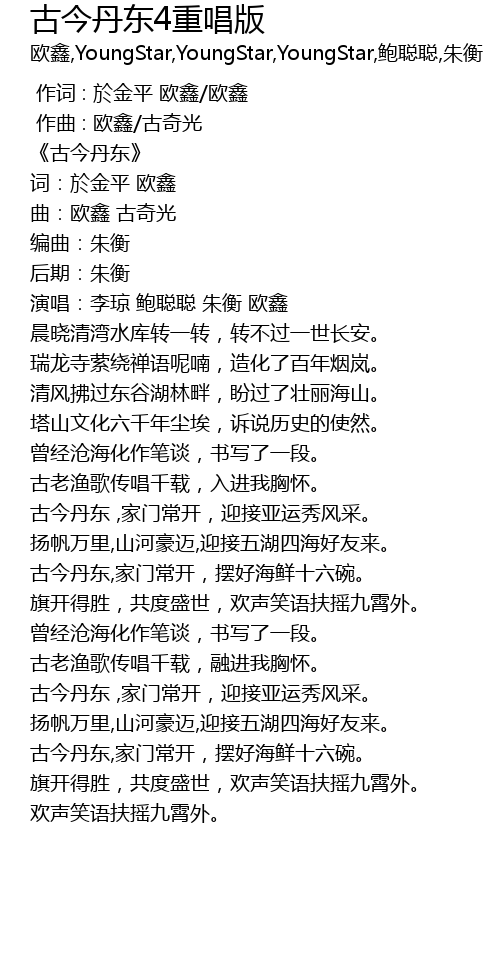 | [01:52.811] | 古今丹东 ,家门常开,迎接亚运秀风采。 |