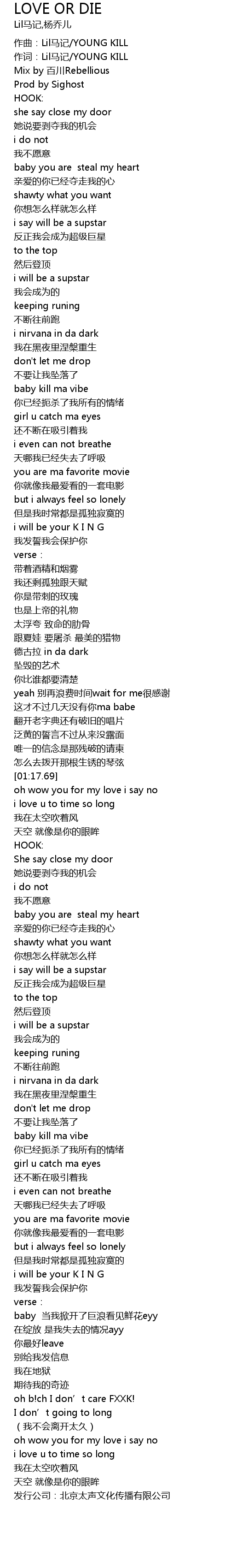 | [00:09.74] | 作词:Lil马记/YOUNG KILL |