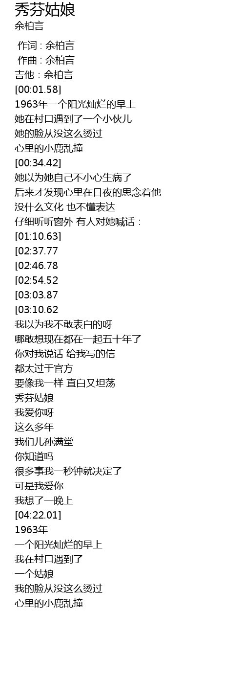 | [03:12.28][02:37.77][01:11.03] | 秀芬姑娘 我爱你呀 |