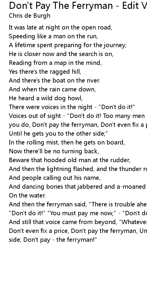 And still that voice came from beyond, "Whatever you do, Don't pay the ferryman, Don't even fix a price, Don't pay the ferryman, Until he gets you to the other side; Don't pay - the ferryman!"