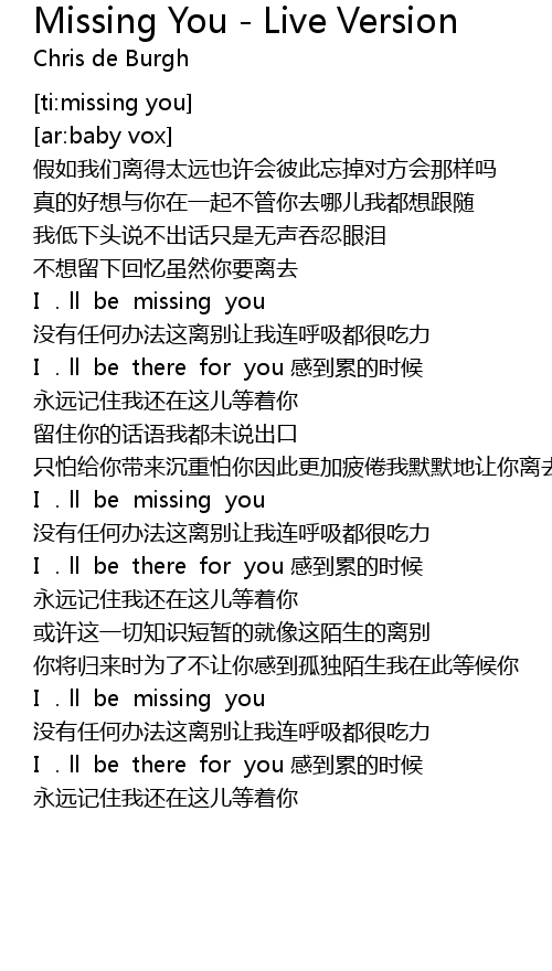 | [02:12.499] | I ll be missing you mei you ren he ban fa zhe li bie rang wo lian hu xi dou hen chi li |