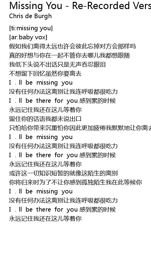 | [02:12.499] | I ll be missing you mei you ren he ban fa zhe li bie rang wo lian hu xi dou hen chi li |