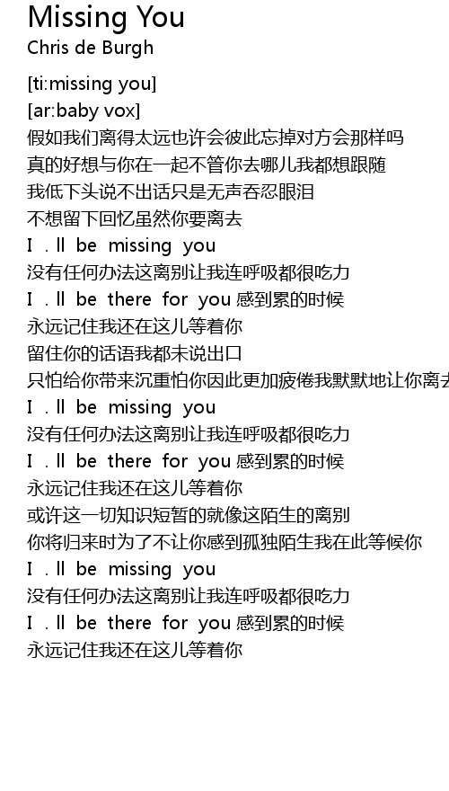 | [02:12.499] | I ll be missing you mei you ren he ban fa zhe li bie rang wo lian hu xi dou hen chi li |