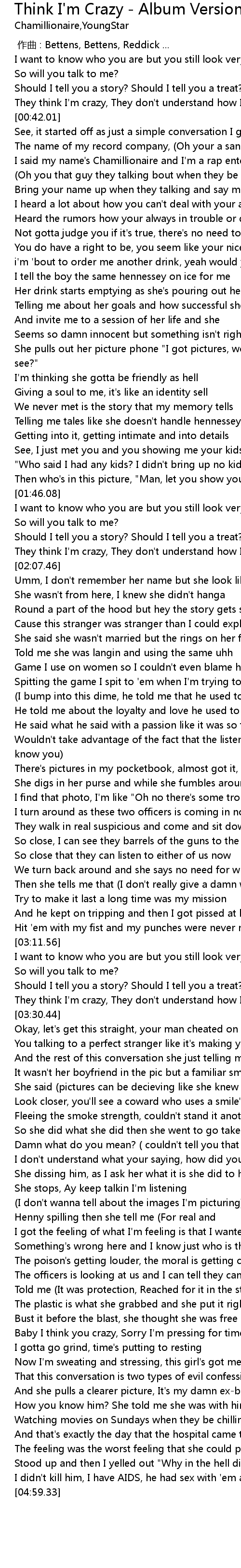| [04:28.93] | Baby I think you crazy, Sorry I' m pressing for time |
