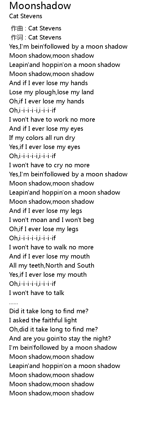 | [00:06.981] | Yes,I'm bein'followed by a moon shadow |