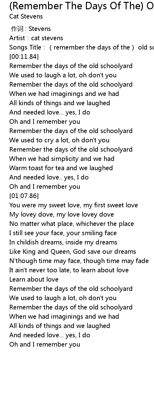 | [00:03.48] | Songs Title: remember the days of the old schoolyard |
