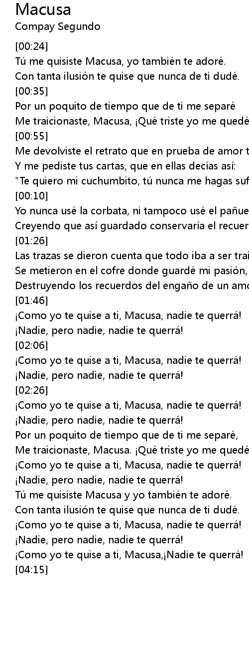 | [00:25] | Tu me quisiste Macusa, yo tambie n te adore. |