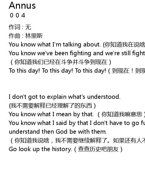 | I don' t got to explain what' s understood. wo bu xu yao jie shi yi jing li jie le de dong xi | |