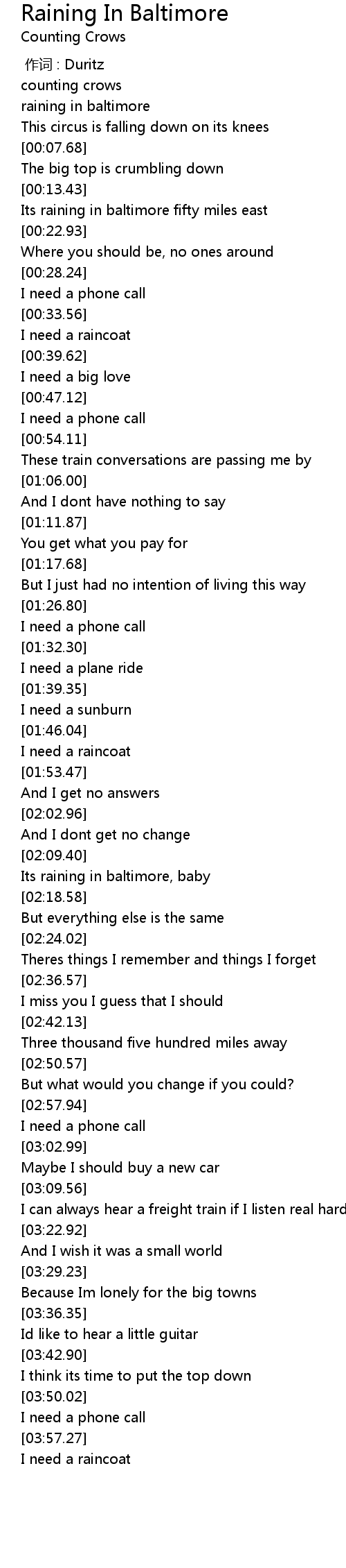 | [00:16.87] | Its raining in baltimore fifty miles east |