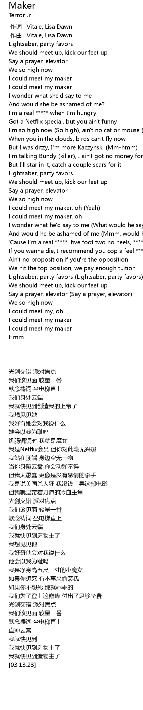 | [02:05.44] | I could meet my maker, oh (Yeah) |
