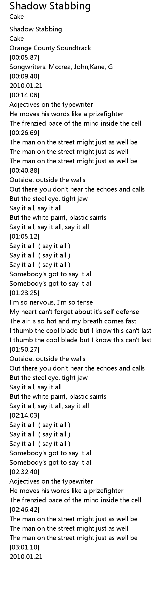 | [00:07.71] | Songwriters: Mccrea, John Kane, G |