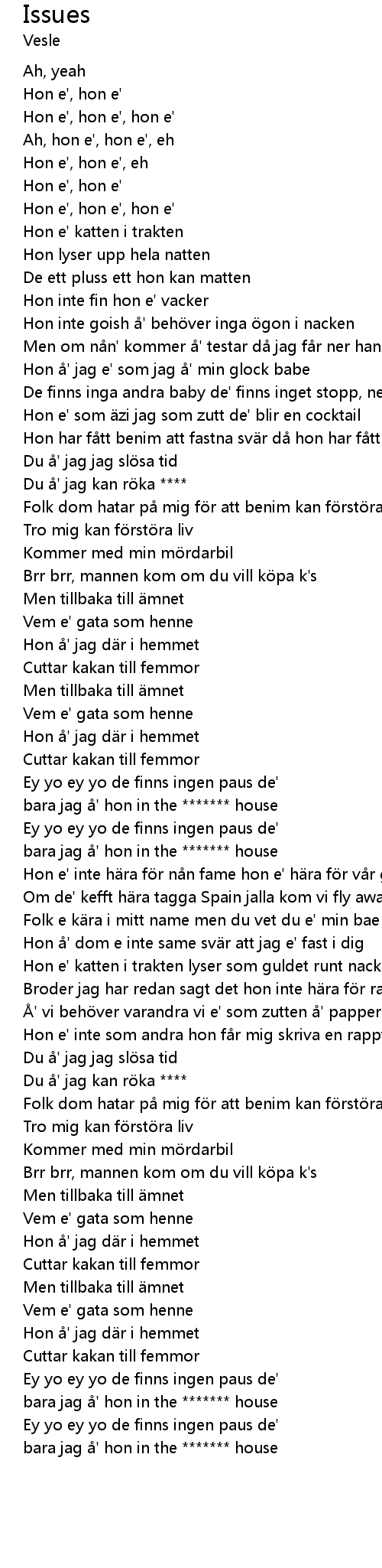 | [01:16.01] | bara jag å' hon in the ******* house |