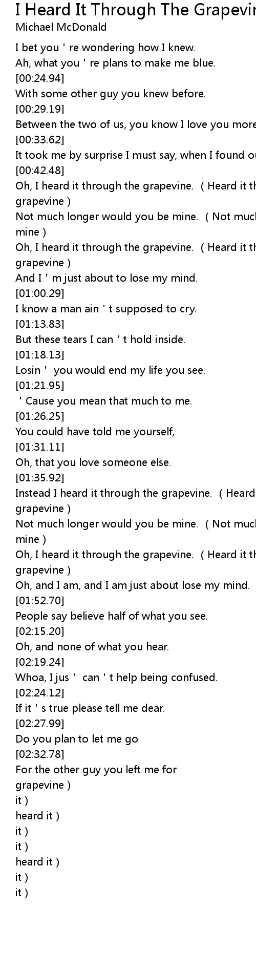 | [01:36.48] | Instead I heard it through the grapevine. (Heard it through the grapevine) |