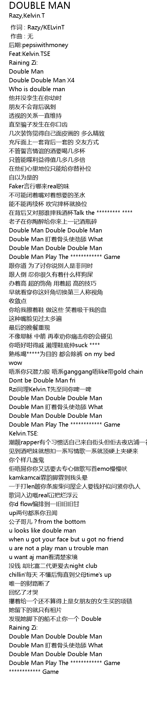 | [02:01.765] | Double Man dīng zhe gú tou shǐ jìn tiǎn What |