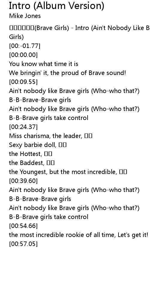 | [00:-07.04] | Brave Girls Intro Ain' t Nobody Like Brave Girls |