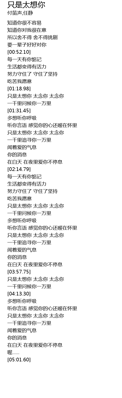 | [01:45.15] | zhǐ shì tài xiǎng nǐ tài niàn nǐ tài niàn nǐ |