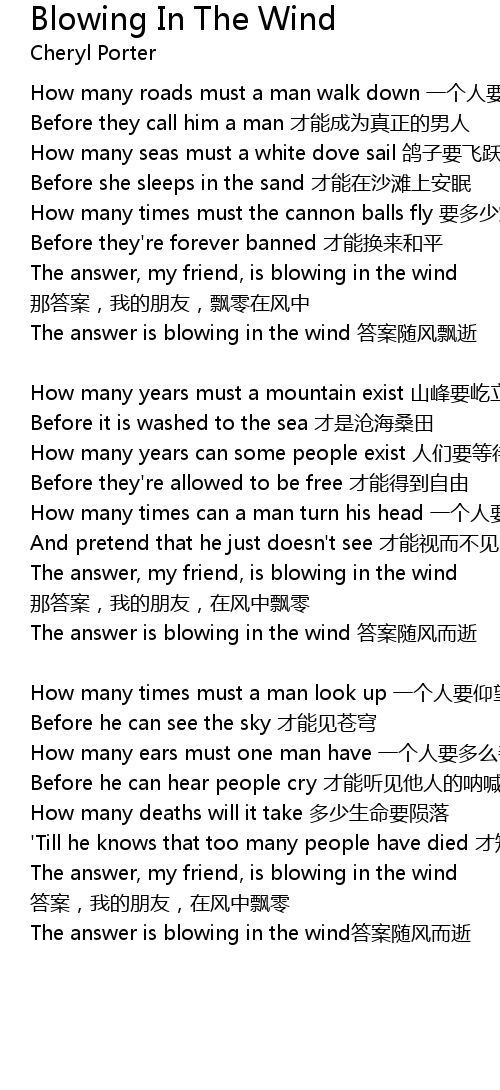 | The answer, my friend, is blowing in the wind na da an, wo de peng you, zai feng zhong piao ling | |