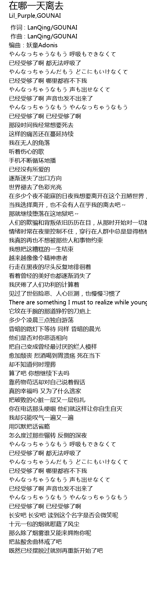 | [00:56.535] | zài duō shǎo gè yè bù néng mèi de rì yè wǒ xiǎng yào lí kāi zài zhè gè chǒu lòu shì jiè, jiù zhè yàng ràng wǒ yuǎn lí zhè gè shì jiān yī qiè |