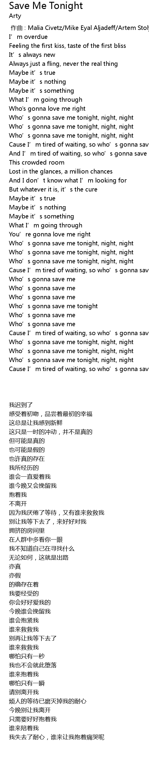 | [02:39.69] | Cause I’m tired of waiting, so who’s gonna save me tonight |
