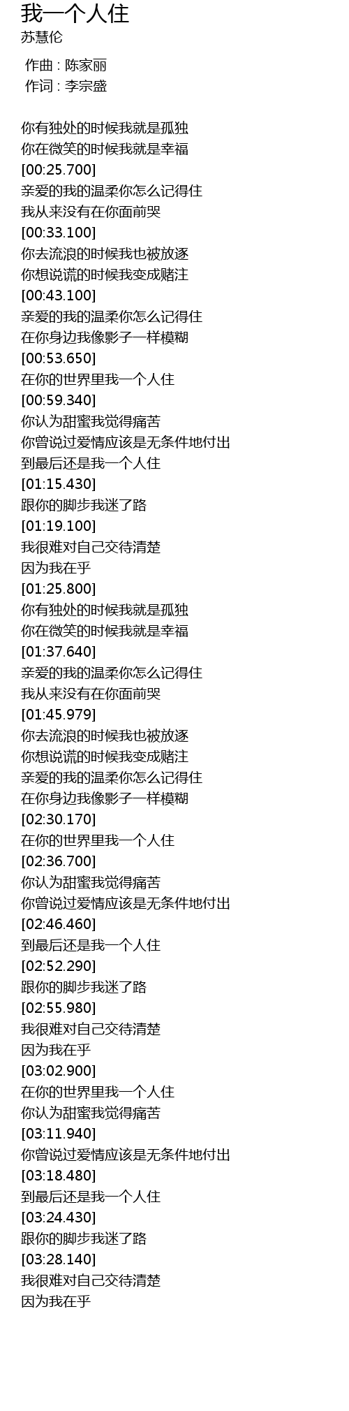 | [03:05.390] | zài nǐ de shì jiè lǐ wǒ yí ge rén zhù |