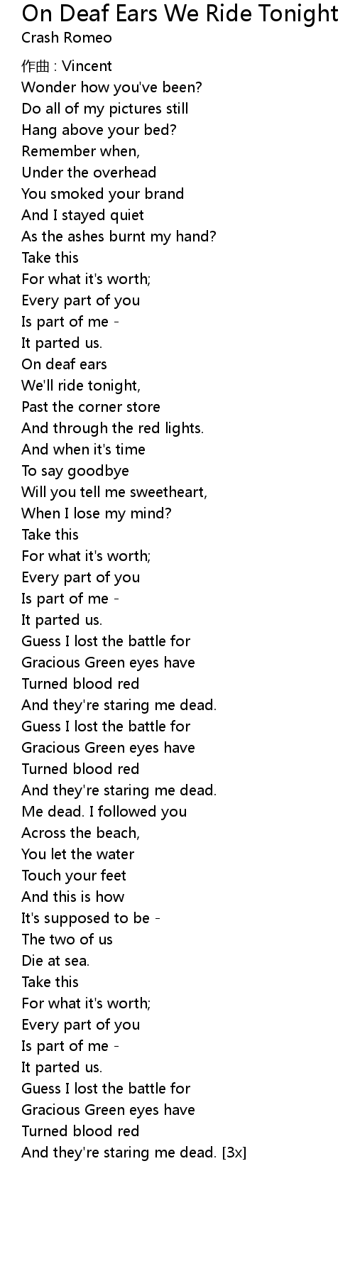 | Song | On Deaf Ears We Ride Tonight |
