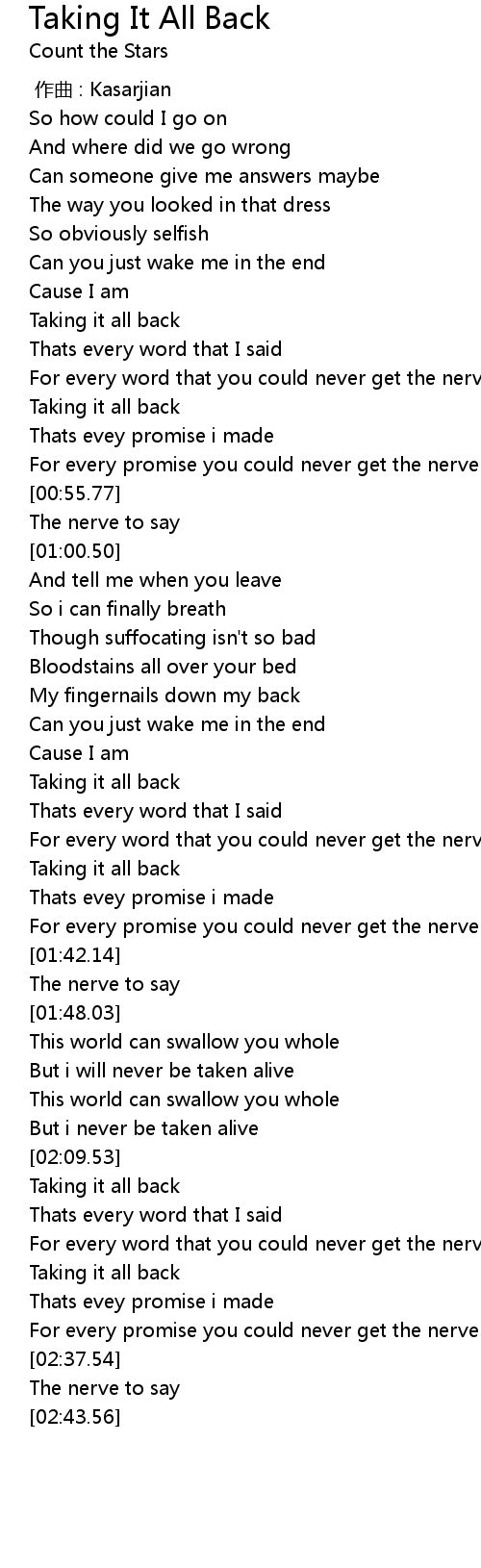 | [00:51.12] | For every promise you could never get the nerve to say |
