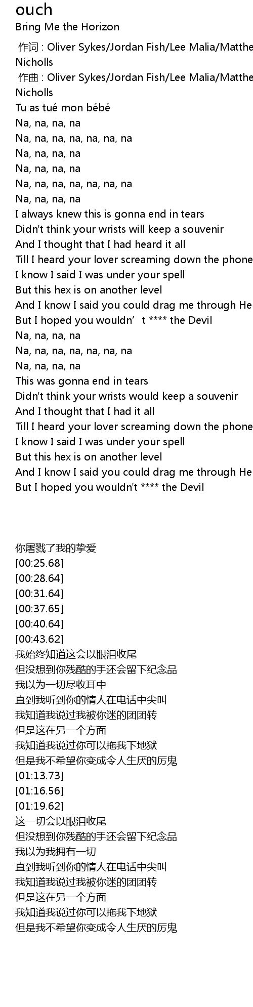 | [00:00.000] | 作词 : Oliver Sykes/Jordan Fish/Lee Malia/Matthew Kean/Matthew Nicholls |