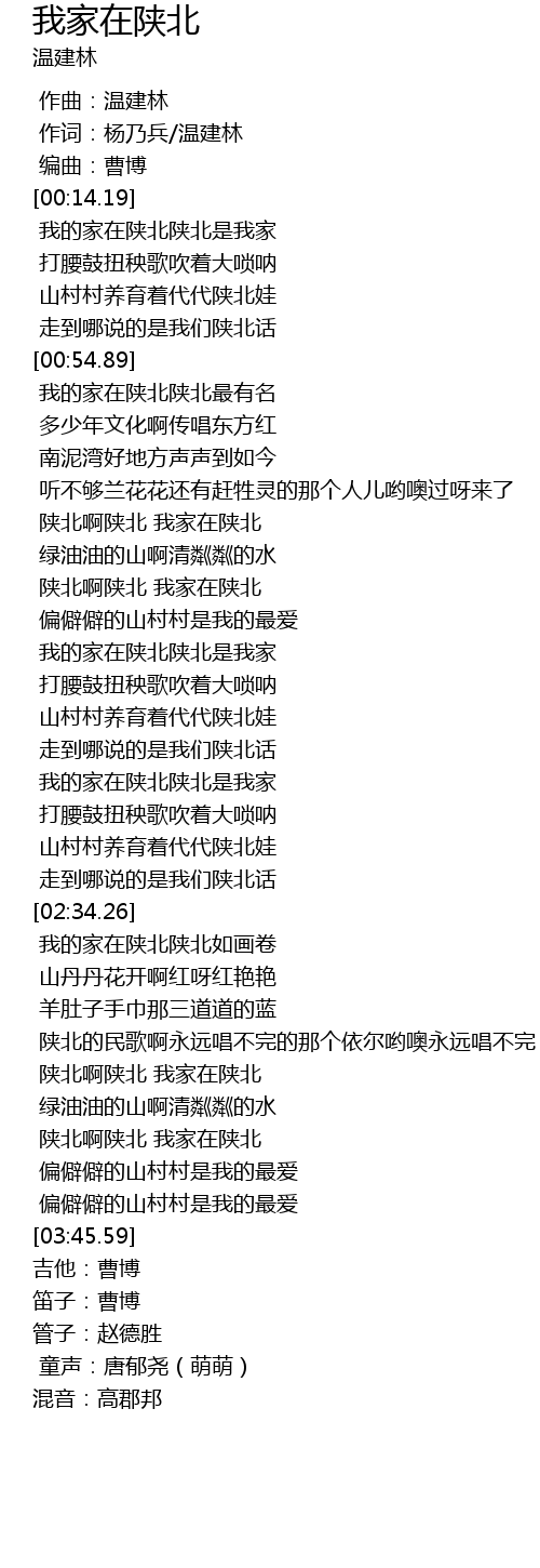 | [01:56.14] | wǒ de jiā zài shǎn běi shǎn běi shì wǒ jiā |