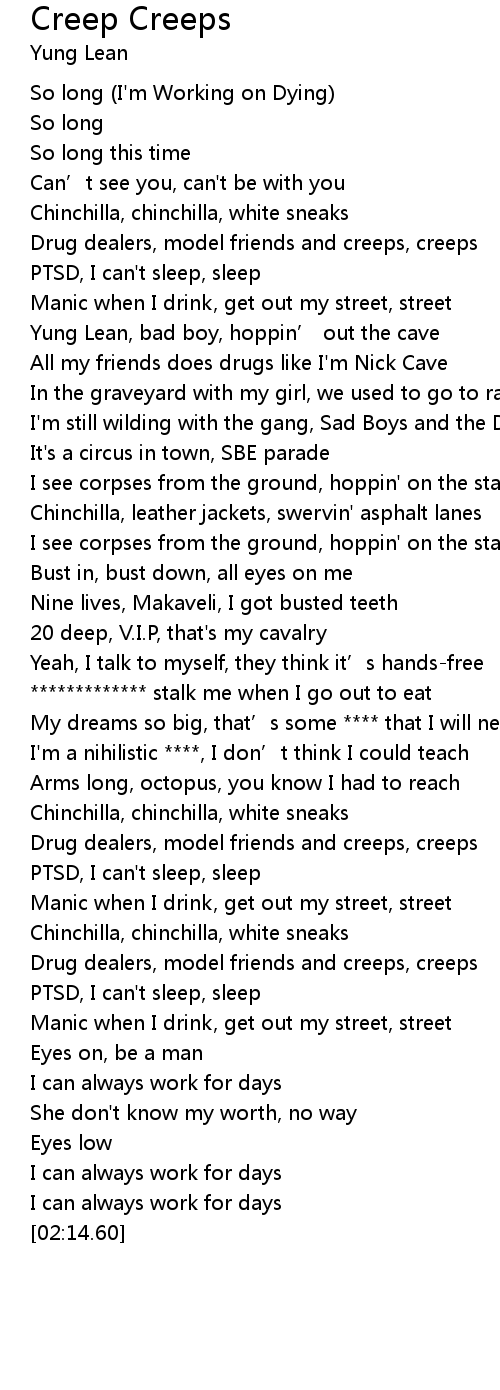 | [00:36.46] | Yung Lean, bad boy, hoppin’ out the cave |