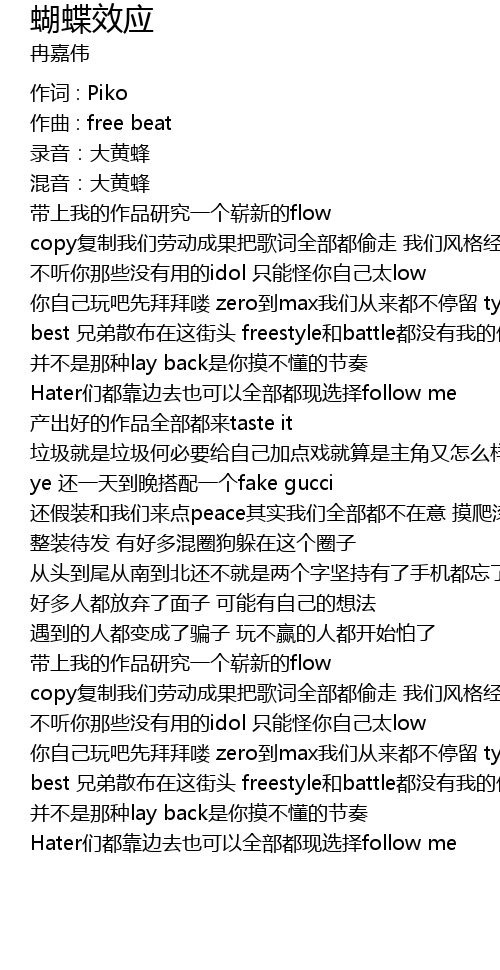 | 带上我的作品研究一个崭新的flow copy复制我们劳动成果把歌词全部都偷走 我们风格经常换 不听你那些没有用的idol 只能怪你自己太low 你自己玩吧先拜拜喽 zero到max我们从来都不停留 tyr to be the best 兄弟散布在这街头 freestyle和battle都没有我的作品秀 并不是那种lay back是你摸不懂的节奏 Hater们都靠边去也可以全部都现选择follow me |