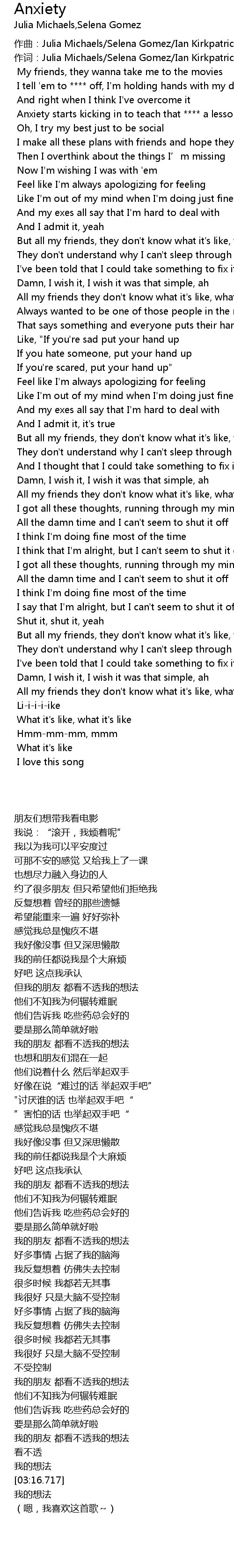 | [00:04.879] | 作词:Julia Michaels/Selena Gomez/Ian Kirkpatrick/Scott Harris |