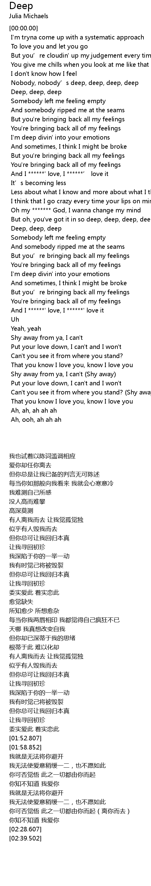 | [00:15.603] | Nobody, nobody' s deep, deep, deep, deep |