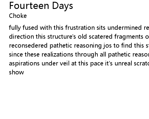 | fully fused with this frustration sits undermined redefined thoughts a change of direction this structure's old scatered fragments of inconsistent alibi reconsedered pathetic reasoning jos to find this structure's old fourteen days since these realizations through all pathetic reasoning how was i to focus on my aspirations under veil at this pace it's unreal scratched away, mistakes won't show |