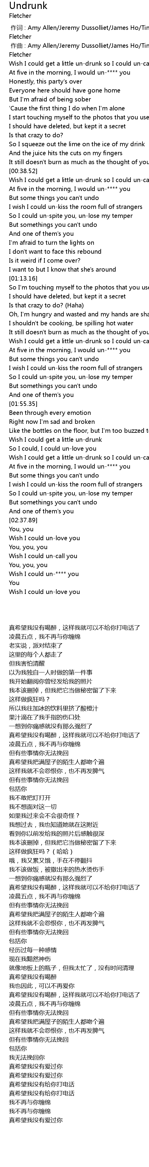 | [00:39.32] | Wish I could get a little undrunk so I could uncall you |